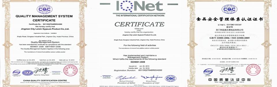 Jingmen City LeiXin Gypsum Product Co., Ltd. is built in 2002, and located in Jingmen City, Hubei Province,Chinawhere there are rich fiber gypsum resources. LeiXin Gypsum is a prestigious manufacturer of food additive gypsum products concentrated on researching technology.“The customer is our god and the quality is our life” is our service tenet. Zealously look forward to your visit and cooperation, achieving win-win! Our StrategyNational High-Tech EnterpriseProvincial Info-Industry Combination Demonstration EnterpriseHigh-purity, High-whiteness, Ultra-fine Calcium Sulfate (gypsum) Production BaseThe Leader of Food Additive Calcium Sulfate (gypsum) IndustryThe Participant of Food Additive Calcium Sulfate Industry Standard ofChinaThe First Owner of National QS Certification as Food Additive Calcium Sulfate (gypsum) SupplierThe First Upgraded Factory Meeting New Food Additive Production StandardPassed ISO9001: 2008 and ISO22000:2005 System Certification About usLeixin Gypsum is built in 2002 and already has 15-year’s history. As food additive gypsum powder’s manufacturer and export enterprise, Leixin Gypsum has three mature products including food additive calcium sulfate, feed additive calcium sulfate and pharmaceutical grade calcium sulfate.Manufactory Leixin Gypsum chooses the best fiber gypsum ore and removes the impurities inside the ore by artificial selecting which includes 6 processes. Leixin Gypsum stores the finished product in the standard warehouse making use of pallet that can ensure the clean, safety and no-pollution of the product.CraftsLeixin Gypsum is the first standard factory meeting national food additive manufacture requirement inChinawhich has two production lines differed by products. Leixin Gypsum uses new craft of indirect calcination on calcium sulfate anhydrous which is also one of the technology patents in Leixin Gypsum.SafetyLeixin Gypsum has the biggest stainless steel workshop of 400㎡ in the food additive calcium sulfate industry to make sure the impurities’ control as possible as we can.QualityLeixin Gypsum has passed third-part authority inspection with 99.7% assay and no lead and arsenic.CustomersThere are many famous enterprises over the world using Leixin Gypsum’s product and Leixin Gypsum also can export by trading companies according to the customers’ requirement. To be the best calcium sulfate supplier ofChina! ——Leixin Gypsum