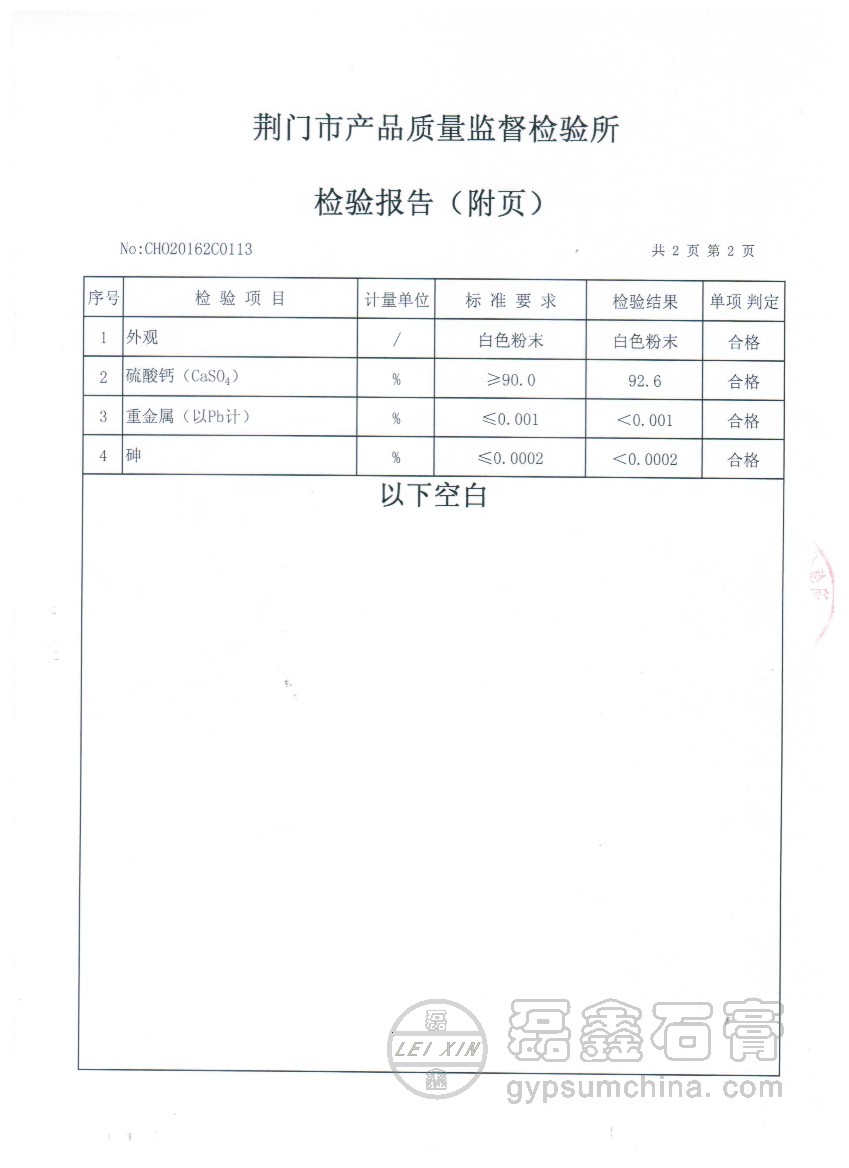 磊鑫石膏作為食用菌行業(yè)的中國(guó)首部《食用菌添加劑硫酸鈣(石膏)》標(biāo)準(zhǔn)的制定者,在嚴(yán)格執(zhí)行批次批檢的基礎(chǔ)上,荊門(mén)市產(chǎn)品質(zhì)量監(jiān)督檢驗(yàn)所于2016年9月對(duì)我公司的食用菌添加劑硫酸鈣(石膏)產(chǎn)品進(jìn)行了檢驗(yàn)。