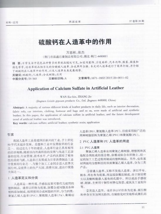 Abstract: A majority of various different kinds of leather products in daily life, such as interior decoration, fabric sofa, car interiors, clothing, footwear and bags and so on, were made of artificial and synthetic leather.In this paper, the application of calcium sulfate in artificial leather, and the future development trend of artificial leather was introduced.