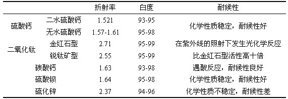 硫酸鈣具有的高白度、良好的流動性、凝膠性、親水性和耐候性使的其在建筑涂層行應用的很廣泛。硫酸鈣同碳酸鈣、二氧化鈦、硫酸鋇、硫化鋅、氧化鋅等作為白色體質(zhì)顏料在涂料、塑料、橡膠、造紙、油墨等中應用。其中在涂料中應用顏料的光學性質(zhì)比較重要,如折射率、光澤度、和耐候性。表4是常用幾種白色顏料的部分性質(zhì)。