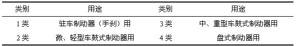 強(qiáng)制性中國(guó)國(guó)家標(biāo)準(zhǔn)、第5763個(gè)標(biāo)準(zhǔn)、2008年由國(guó)家質(zhì)檢總局和國(guó)標(biāo)委聯(lián)合發(fā)布的,國(guó)標(biāo)GB 5763-2008《汽車用制動(dòng)器襯片》[1],其中襯片按用途可分為四類,詳情見表1。