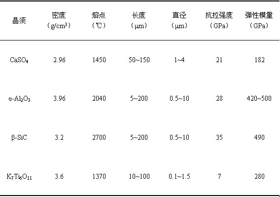硫酸鈣晶須是以生石膏為原料在人工控制下以單晶形式生長(zhǎng)的無(wú)水硫酸鈣纖維狀單體。硫酸鈣晶須以均勻的橫截面、完整的外形及高度完善的內(nèi)部結(jié)構(gòu)通常作為復(fù)合材料的增強(qiáng)組元,以此來(lái)制備性能優(yōu)異的復(fù)合材料。表1為硫酸鈣晶須與其他晶須的主要性能比較。