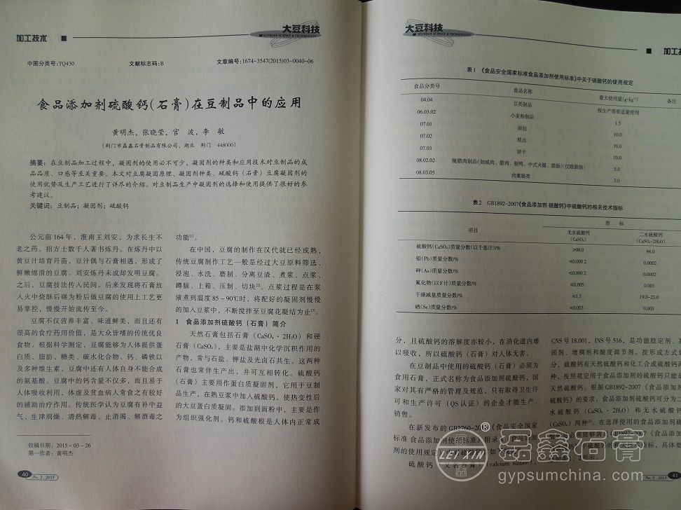 中國是大豆的故鄉(xiāng),中國栽培大豆己有五千年的歷史,同時也是最早研發(fā)生產(chǎn)豆制品的國家。幾千年來,漢族勞動人民利用各種豆類創(chuàng)制了許多影響深遠(yuǎn),廣為流傳的豆制品,如豆腐、豆腐絲、腐乳、豆?jié){、豆豉、醬油、豆芽、豆腸、豆筋、豆魚、羊肚絲、貓耳、素雞翅、大豆耳等美食。豆制品是以大豆、小豆、綠豆、豌豆、蠶豆等豆類為主要原料,經(jīng)加工而成的食品,其中特別提到大多數(shù)豆制品是由大豆的豆?jié){凝固而成的豆腐及其再制品,文章主要從硫酸鈣(石膏)在豆腐中的應(yīng)用方面來詮釋在豆制品中的應(yīng)用。