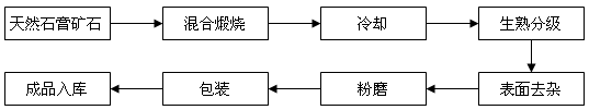 進入工業(yè)化生產后,生產工藝上仍然是基于傳統(tǒng)的加工原理將天然石膏礦石(生石膏,主要成分為二水硫酸鈣)直接與一定量的煤和木材等燃料混合煅燒,具體工藝流程是通常采用立面半開口頂面全開口的土法石灰窯;一層煤及其它燃料一層未清洗的石膏原礦間隔堆滿整個窯體后在頂面蓋上鐵板罩子;從窯體下底火道點火引燃煤及其它燃料,待煤及其它燃料燃盡自然冷卻后,采用人工將煅燒后的石膏礦石與煤渣等雜物分離出窯;然后繼續(xù)采用人工對出窯后塊狀石膏進行生熟分級、表面去雜等工序后進行粉磨、包裝而成。