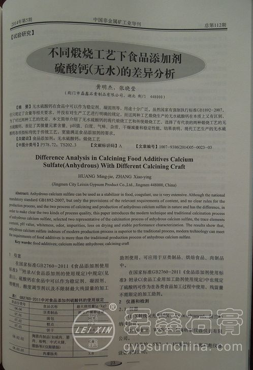 Key words: food additives; calcium sulfate anhydrous; calcining craft