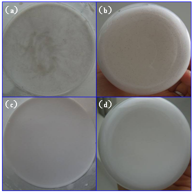 圖1為統(tǒng)工藝和現代工藝生產的食品添加劑硫酸鈣(無水)氣味雜質對比圖片,通過上述實驗方法,傳統(tǒng)工藝如圖1(a)、(b)所示,通過水洗法可以發(fā)現溶液表面有黑色浮層,燒杯底部有一定的黑色雜質和其它物質,且伴有一定的臭雞蛋氣味和其它異味,分析原因是由于將煤、木材等燃料直接與礦石原料進行接觸,這些燃料燃燒時產生的SO2、H2S等氣體會殘留于無水硫酸鈣產品中,同時由于后期人工處理環(huán)節(jié)上的缺陷,傳統(tǒng)工藝沒有辦法完全去掉異味和雜質,從而生產的產品存在不同程度的缺陷。